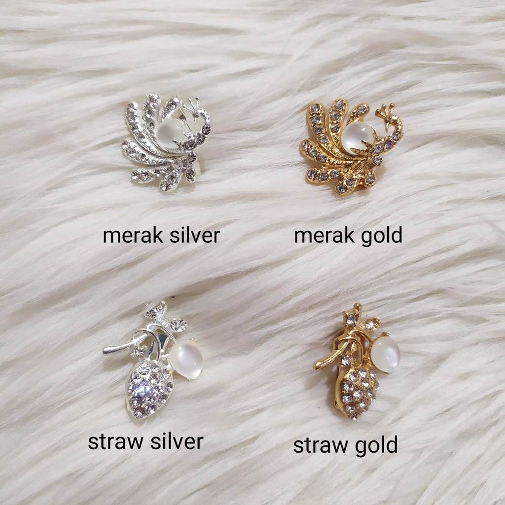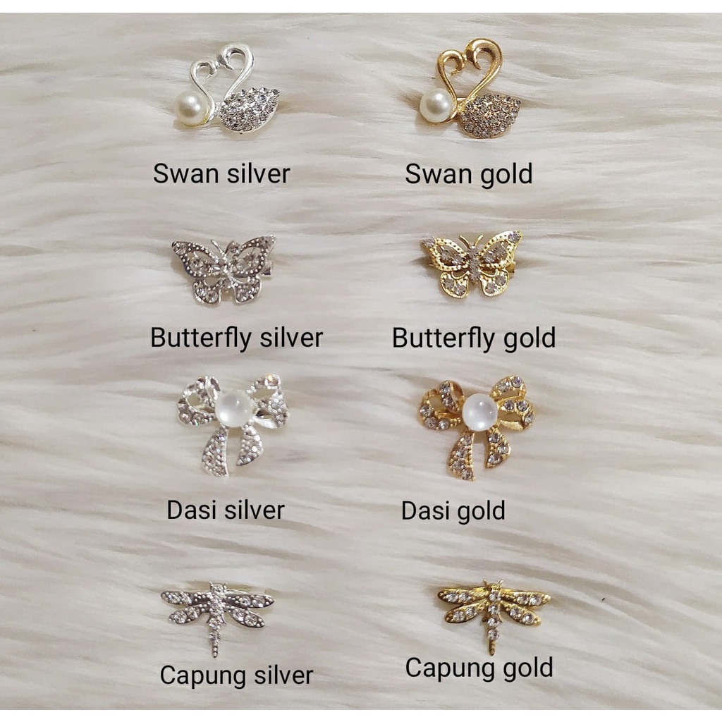 Produk ini memiliki 34 Variasi Variasi yaitu : Merak Silver,B,Merak Gold,Straw Silver,Straw Gold,F,G,H,A,C,D,E,1,2,3,P,Q,R,S,T,U,V,W,X,Y,Min order 100 pcs,Swan Silver,Butterfly Silver,Dasi Silver,Capung Silver,Swan Gold,Butterfly Gold,Dasi Gold,Capung Gold,