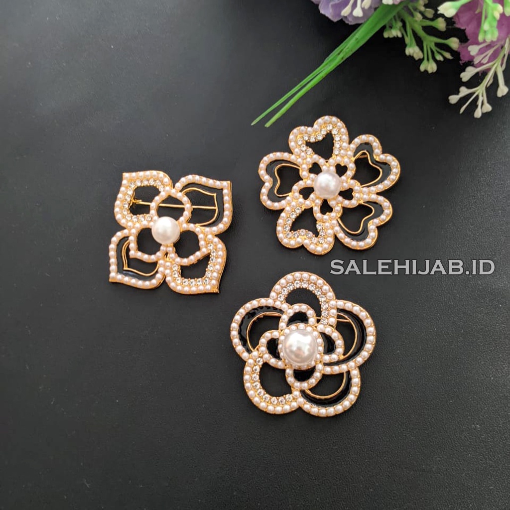 Bros Dagu Korea Kecil Aksesoris Jilbab Hijab Kerudung Wanita Silver Black White Hitam Putih Small Brooch Pin Peniti Motif Bunga Pita Mutiara 1